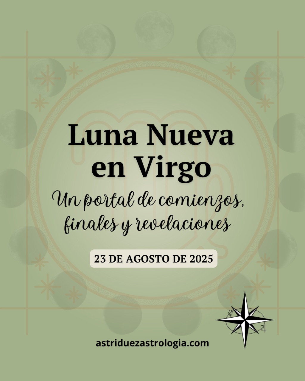 Esta Luna Nueva, que se da el 23 de agosto, tiene un carácter muy especial, ya que este año se darán dos en el mismo signo. La primera ocurre el 23 de agosto, en el grado 0º de Virgo, y la segunda el 21 de septiembre, en el grado 29º de Virgo, que además será un Eclipse Parcial de Sol. Este novilunio marca la apertura de la temporada de eclipses, iluminada por el Sol en Virgo, mientras nos acercamos al Nodo Sur.